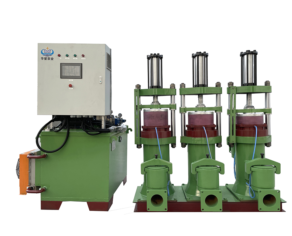 泵開始給壓濾機進料和低壓過濾時保持大流量不變,隨壓濾機空腔充滿物料壓力升高,壓濾機過濾能力開始變小,達到設定值時液壓系統控制YBH泵的運行速度降低、輸出流量變小。壓濾機過濾能逐漸降低,進料壓力逐漸升高,泵的進料流量自動變小,最小流量為額定流量的20%,泵輸出流量壓力曲線與壓濾機最佳過濾曲線基本吻合。全過程因此高效節能,比渣漿泵節能60%以上。
